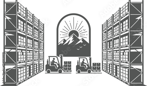 Fototapeta premium Warehouse Interior with Shelves and Forklifts Silhouette