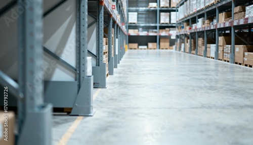 © Generative AI, Obraz premium Warehouse Interior with Shelves and Merchandise Boxes, Supply Chain Logistics, Retail Distribution Center