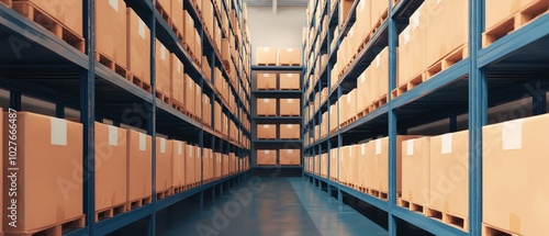 Fototapeta premium Warehouse interior with stacked boxes on metal shelves and clear aisles.