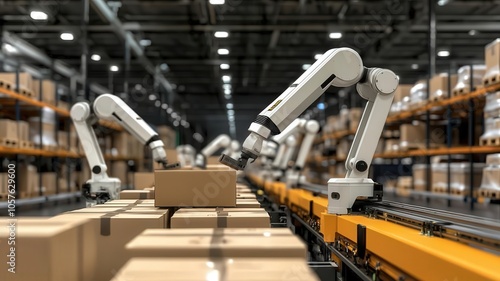 © Gunn, Naklejka premium Warehouse management logistic technology concept. Robot-assisted packing stations in a tech-enabled warehouse, logistics innovation, efficiency in packaging