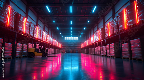 Fototapeta premium Warehouse - meticulous symmetry - low angle shot - shipping and receiving - logistics - port - in land port - warehousing - neon lighting