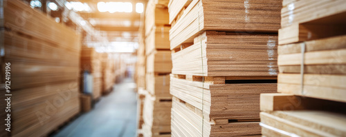 Obraz premium Warehouse storing large stacks of plywood boards