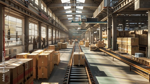 Naklejka premium Warehouse with conveyor belts and packed boxes, capturing the storage system