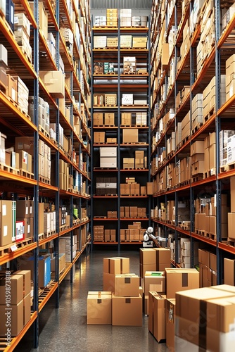 © Somchai, Obraz premium Warehouse with stacked boxes on shelves.