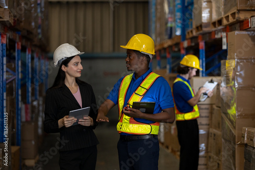 © eakgrungenerd, Obraz premium Warehouse worker and female supervisor discussing logistics tasks with digital tablets while another staff inspects inventory. Concept of teamwork, digital operations and smart supply chain