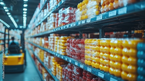 © Рудой Максим, Naklejka premium Warehouse worker organizing shelves with colorful jars during afternoon shift in a busy distribution center