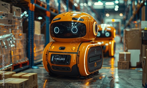 Fototapeta premium warehouse worker with a robot in a factory, a robot in a warehouse.