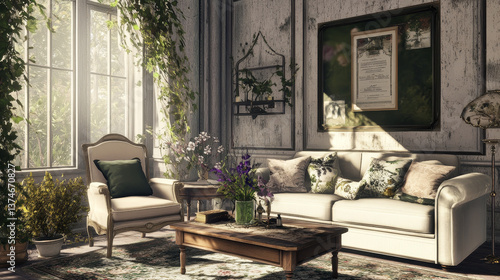© Sahraya, Fototapeta premium Warm and cozy living room interior with mock up poster frame, modern coffee table, modular sofa, oval shapes armchair, vase with dried flowers, pillows and personal accessories. Home decor. Template.
