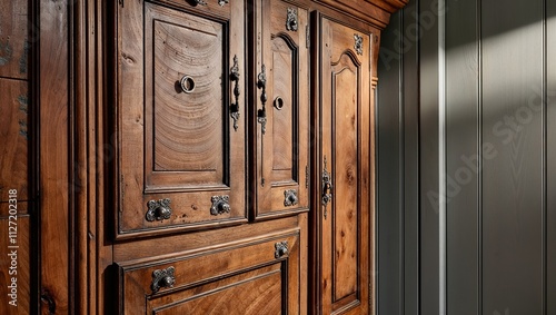 © Dwiyan, Fototapeta premium Warm and inviting close-up photo of a traditional gray and wood kitchen.