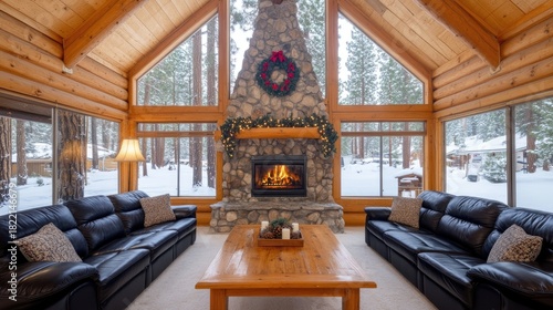 © lililia, Naklejka premium Warm and inviting, the cabin's living room features black leather couches, a wooden table, and a large stone fireplace, complemented by festive decorations and a snowy landscape outside