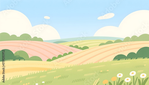 © lin, Fototapeta premium Warm and tranquil summer landscape flat illustration