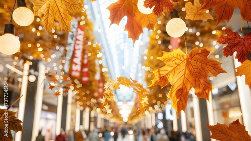 © Alfiyah, Naklejka premium Warm Autumnal Decorations: Hanging Maple Leaves and Glowing Lights Adorn a Modern Indoor Space, Creating a Festive Fall Atmosphere