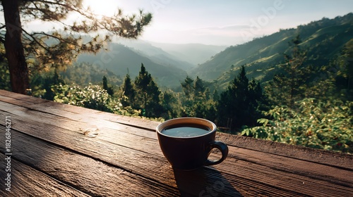 © irawan, Obraz premium Warm beverage rests upon weathered wood overlooking a sprawling mountainous landscape bathed in morning light