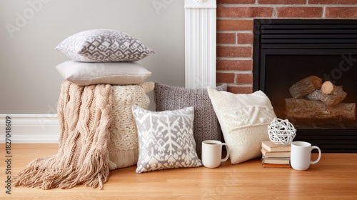 © lililia, Naklejka premium Warm blankets and stacks of books sit beside soft candlelight and steaming mugs in front of a flickering fireplace