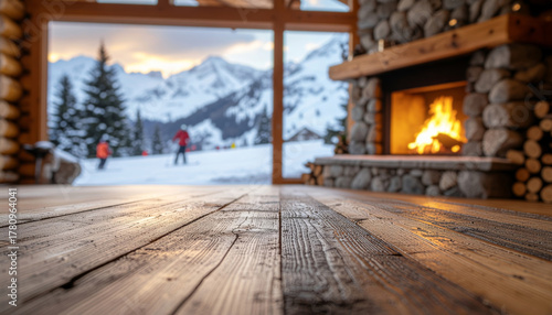 Fototapeta premium Warm cabin interior with glowing fireplace and snowy alpine landscape view, perfect for cozy winter poster or cabin lifestyle background template