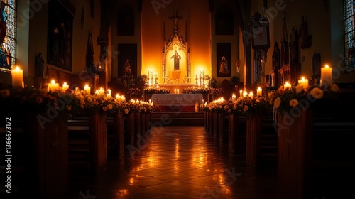 Fototapeta premium Warm Candlelit Sanctuary with Decorative Flowers in Calm Church