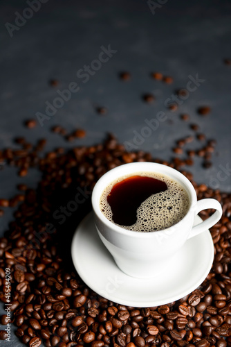 Fototapeta premium Warm cup of coffee with coffee beans over black background. Coffee time, copy...