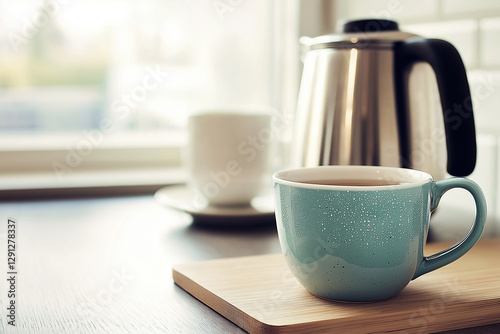Fototapeta premium Warm cup of tea on a wooden table beside a kettle and a white cup in a cozy setting