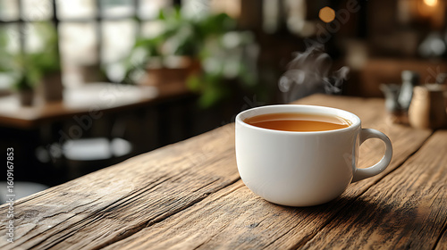 © YessyIzzatun, Obraz premium Warm Cup of Tea on Rustic Wooden Table in Cozy Cafe