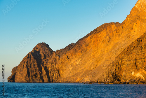 Naklejka premium Warm dawn light illuminates the rocks of the south coast of the Greek island...