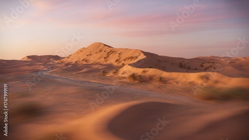 Naklejka premium Warm desert landscape at sunset with sand dunes and distant hills under a...