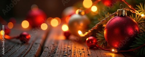 Fototapeta premium Warm, glowing string lights entwined with red and gold ornaments , sparkle,...