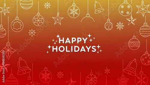 Fototapeta premium Warm gradient background in red and orange hues adorned with outline christmas ornaments, stars, bells, and snowflakes, featuring a central sparkling text of happy holidays