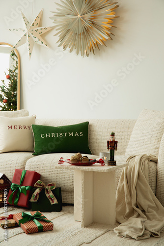 © FollowTheFlow, Obraz premium Warm holiday living room with Christmas cushions, wrapped gifts, and soft neutral textures creating a festive and inviting atmosphere.