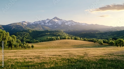 Fototapeta premium Warm hues illuminate the mountain range as evening descends, highlighting snow-capped peaks and golden fields below, showcasing nature's beauty.