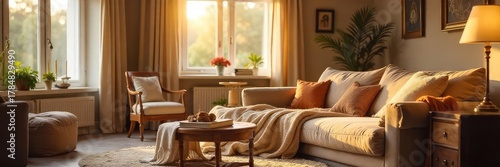 Fototapeta premium Warm, inviting interior scene featuring soft lighting, comfortable furniture,...