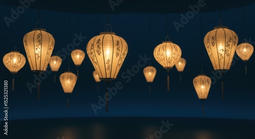 Obraz premium Warm lanterns illuminate a dimly lit space adorned with floral designs...