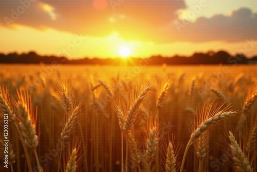 © Anulak, Obraz premium Warm light dances across golden wheat fields at sunset, golden hues, wheat field