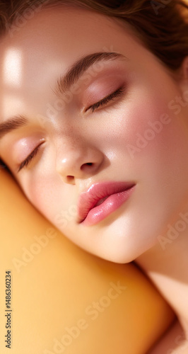 Obraz premium Warm light enhances the peacefulness of a woman resting with closed eyes.