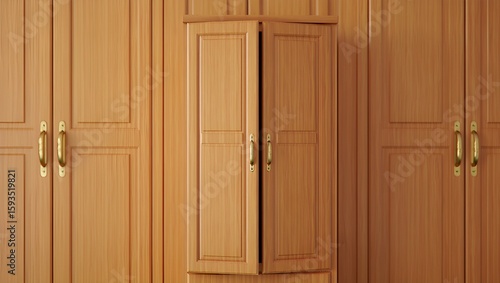 © Ayahe Stock, Fototapeta premium Warm light highlights the natural wood grain of a built-in wardrobe with doors slightly open.