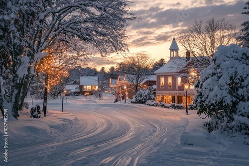 Obraz premium Warm Lights in Snow Covered Village at Sunset