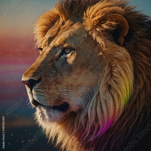 © M, Naklejka premium Warm Lion Illustration with Bold Rainbow Line Effects.