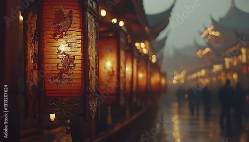 © Luxetify, Obraz premium Warm-Lit Lanterns on a Rainy Asian Street at Night
