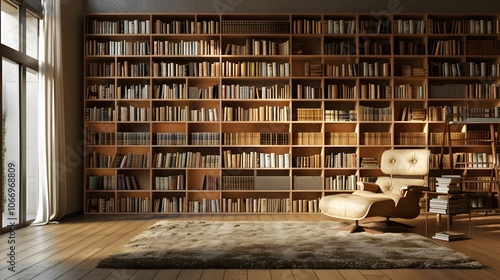 Obraz premium Warm minimalist library with neatly arranged bookshelves AI generated illustration