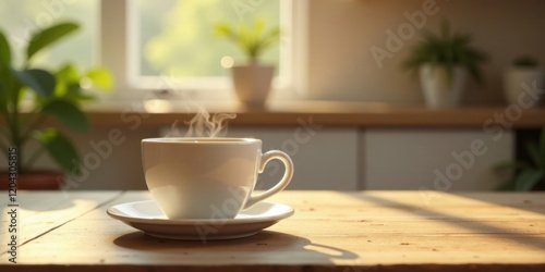 © Vibrant Visions Pixe, Obraz premium Warm Morning Sunlight Illuminates a Steaming Mug of Coffee on a Rustic Wooden Table, Surrounded by Indoor Plants
