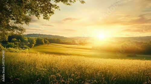 © ALIS ST, Obraz premium Warm morning sunlight over a peaceful countryside, with space for text.