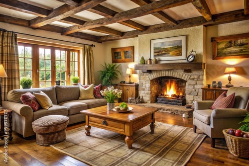 Naklejka premium Warm oak furniture creates a comfortable haven in this traditional country cottage, paired with a tranquil fireplace