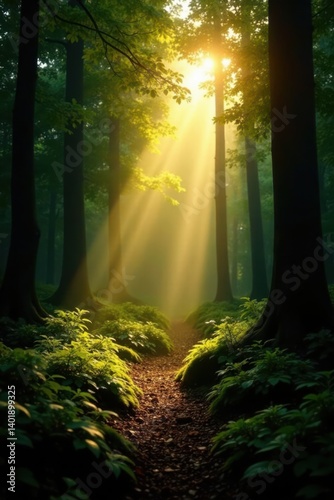 Obraz premium Warm rays of sunlight illuminate the forest's lush vegetation, sunlight filtering, trees