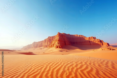 Naklejka premium Warm Sandy Desert Landscape with Ripples and Blue Sky Scenic Dunes and Distant Mountains Under Clear Sunny Sky In Arid Climate