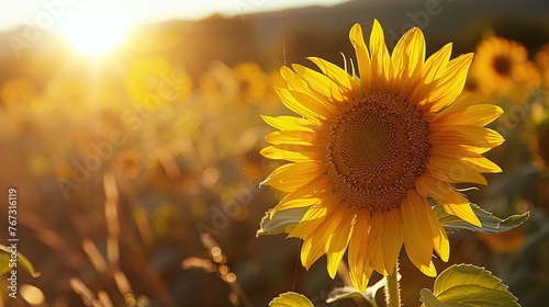 Naklejka premium warm sunflower closeup highlighting the golden petals and cheerful nature of this bright and vibrant flower in a sunlit summer garden