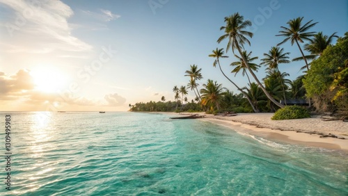 Fototapeta premium Warm sunlight casts a serene glow on turquoise waters at a tropical beach with swaying palm trees, beach scene, ocean water, driftwood, natural beauty
