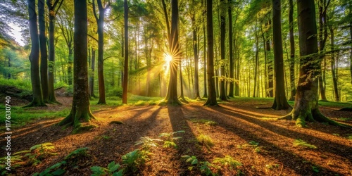 © Watcharapon, Obraz premium Warm sunlight filters through dense forest foliage
