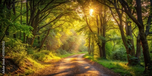 © Nasnunt, Obraz premium Warm sunlight filters through leafy branches onto a winding forest path