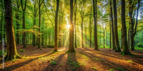 Obraz premium Warm sunlight filters through leafy forest canopy, casting dappled shadows on the forest floor, nature