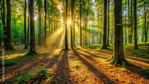 Fototapeta premium Warm sunlight filters through leafy trees, casting dappled shadows on forest floor, sunlight, nature
