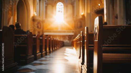 Fototapeta premium Warm Sunlight Illuminating Church Pew and Aisle Creates a Sacred Atmosphere :...
